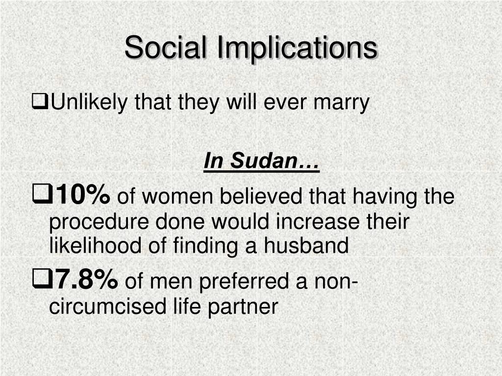 Social Implications • Unlikely that they will ever marry In Sudan… • 10% of women believed that having the procedure done would increase their likelihood of finding a husband • 7.8% of men preferred a non-circumcised life partner