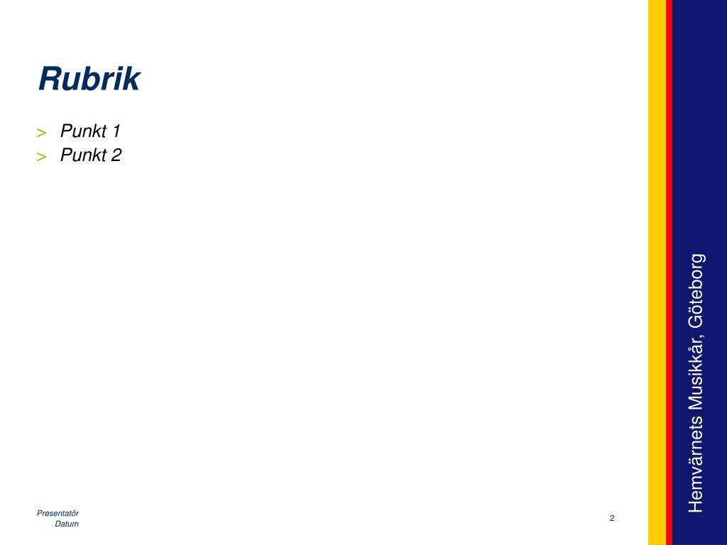 HvMk Göteborg Titel. Presentatör Hemvärnets Musikkår, Göteborg/Göteborg Symphonic Band Datum. Punkt 1 Punkt 2. Rubrik. 2. Datum.