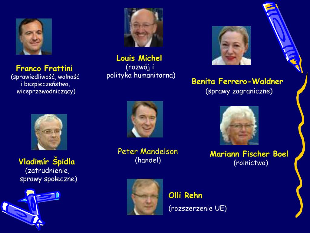 Louis Michel (rozwój i polityka humanitarna) Franco Frattini (sprawiedliwość, wolność i bezpieczeństwo, wiceprzewodniczący) Benita Ferrero-Waldner (sprawy zagraniczne) Peter Mandelson (handel) Mariann Fischer Boel (rolnictwo) Vladimír Špidla (zatrudnienie, sprawy społeczne) Olli Rehn (rozszerzenie UE)