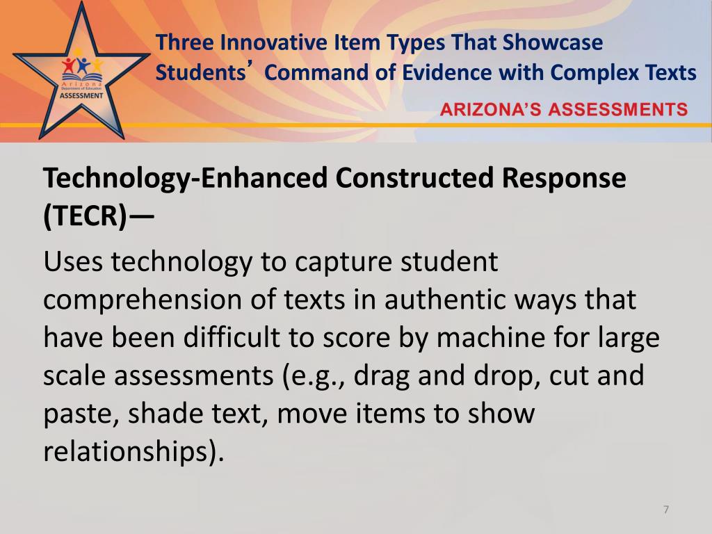 Three Innovative Item Types That Showcase Students’ Command of Evidence with Complex Texts Technology-Enhanced Constructed Response (TECR)— Uses technology to capture student comprehension of texts in authentic ways that have been difficult to score by machine for large scale assessments (e.g., drag and drop, cut and paste, shade text, move items to show relationships).