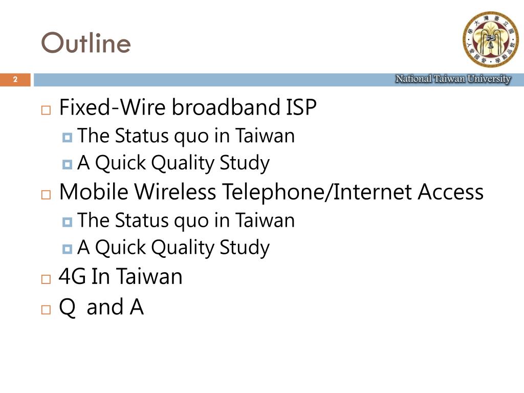 Outline • Fixed-Wire broadband ISP • The Status quo in Taiwan • A Quick Quality Study • Mobile Wireless Telephone/Internet Access • The Status quo in Taiwan • A Quick Quality Study • 4GIn Taiwan • Q and A