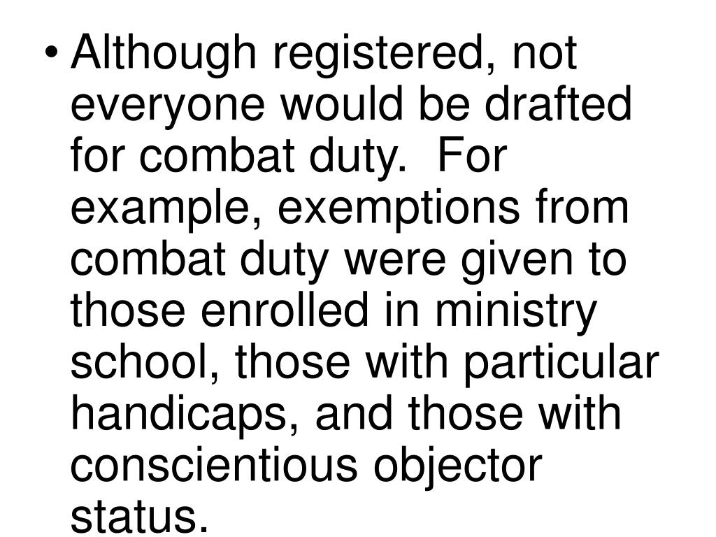 Although registered, not everyone would be drafted for combat duty. For example, exemptions from combat duty were given to those enrolled in ministry school, those with particular handicaps, and those with conscientious objector status.