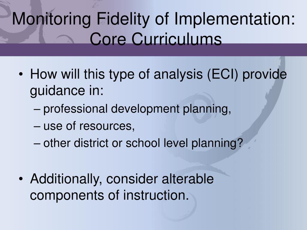 Monitoring Fidelity of Implementation: Core Curriculums • How will this type of analysis (ECI) provide guidance in: • professional development planning, • use of resources, • other district or school level planning? • Additionally, consider alterable components of instruction.