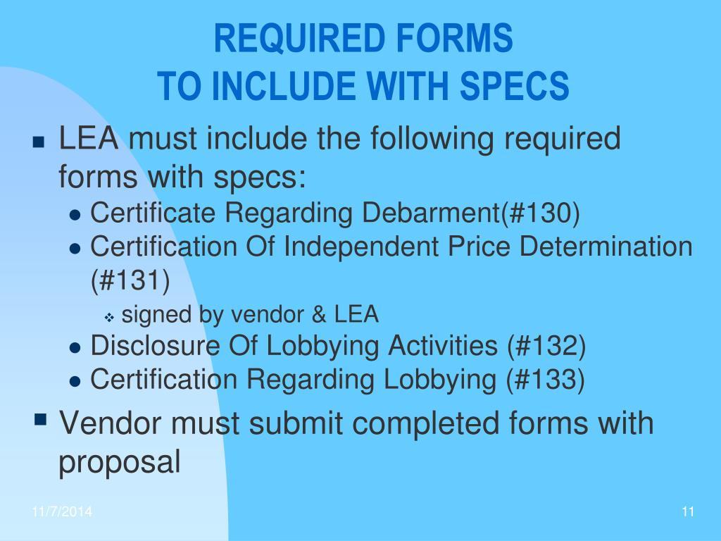 REQUIRED FORMSTO INCLUDE WITH SPECS • LEA must include the following required forms with specs: • Certificate Regarding Debarment(#130) • Certification Of Independent Price Determination (#131) • signed by vendor & LEA • Disclosure Of Lobbying Activities (#132) • Certification Regarding Lobbying (#133) • Vendor must submit completed forms with proposal
