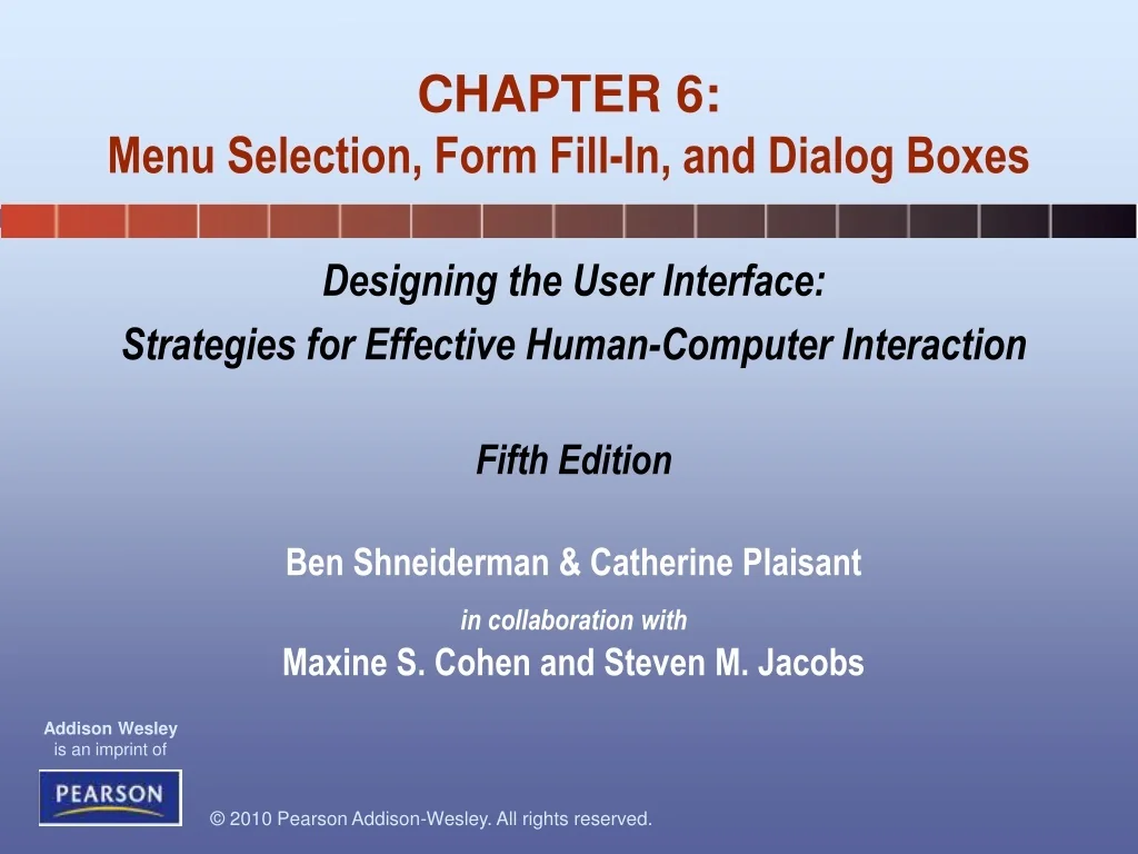 Designing the User Interface: Strategies for Effective Human-Computer Interaction Fifth Edition Ben Shneiderman & Catherine Plaisant in collaboration withMaxine S. Cohen and Steven M. Jacobs CHAPTER 6:Menu Selection, Form Fill-In, and Dialog Boxes
