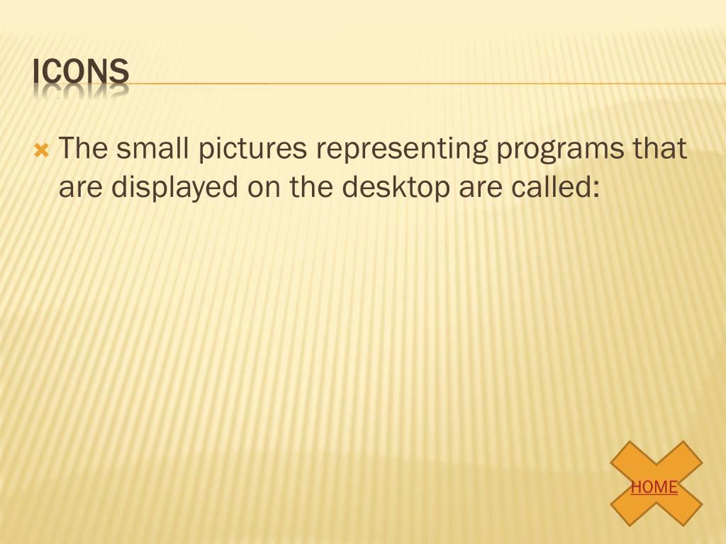 The small pictures representing programs that are displayed on the desktop are called: icons HOME