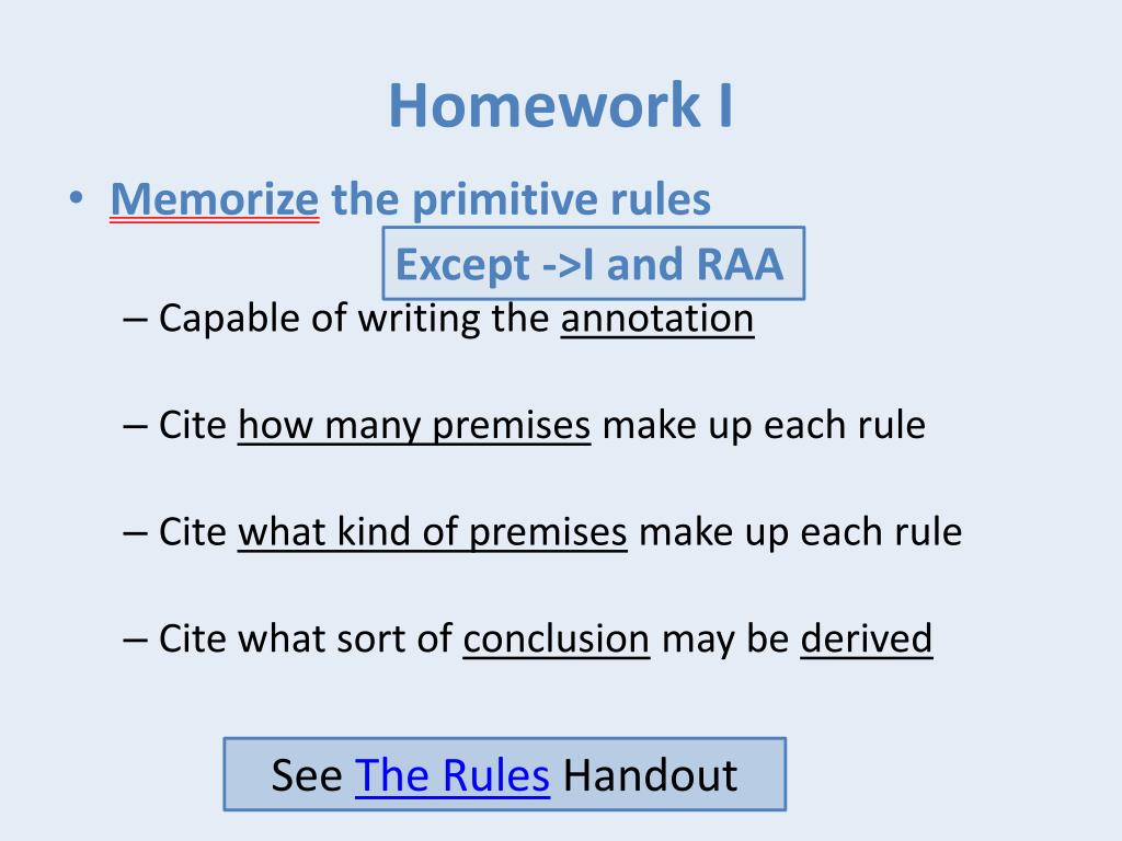 Homework I • Memorize the primitive rules • Capable of writing the annotation • Cite how many premises make up each rule • Cite what kind of premises make up each rule • Cite what sort of conclusion may be derived Except ->I and RAA See The Rules Handout