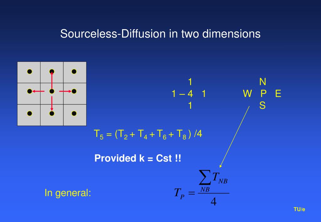 Sourceless-Diffusion in two dimensions 1 1 – 4 1 1 N W P E S T5 = (T2 + T4 +T6 + T8 ) /4 Provided k = Cst !! In general: