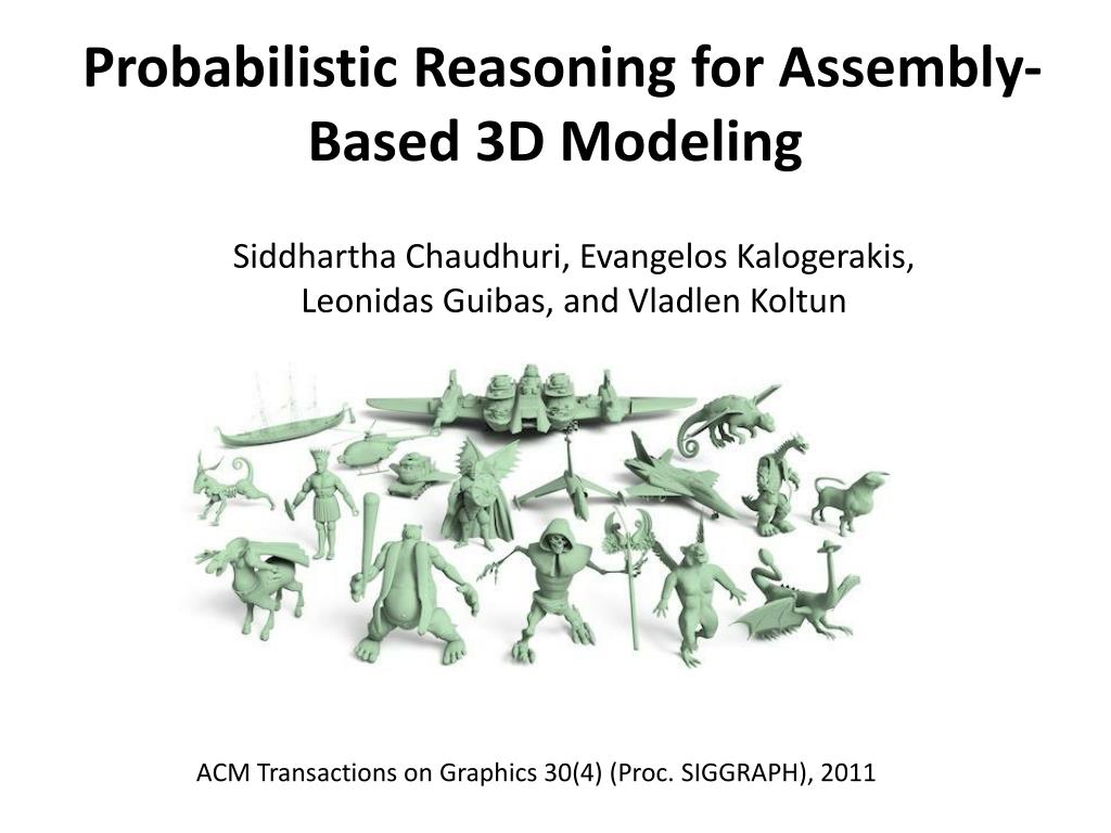 Probabilistic Reasoning for Assembly-Based 3D Modeling Siddhartha Chaudhuri, EvangelosKalogerakis, Leonidas Guibas, and VladlenKoltun ACM Transactions on Graphics 30(4) (Proc. SIGGRAPH), 2011