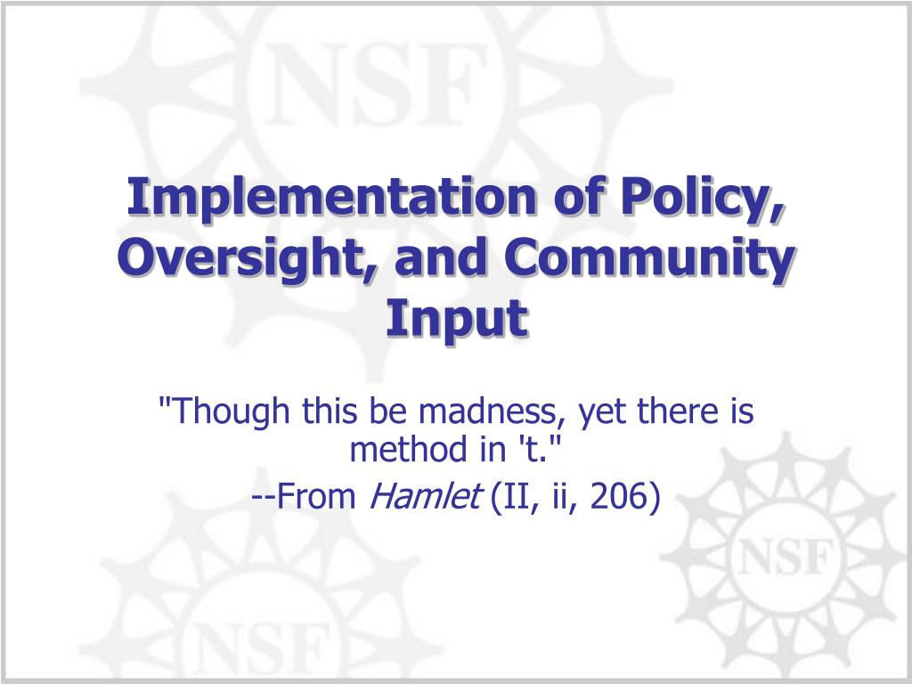 Implementation of Policy, Oversight, and Community Input "Though this be madness, yet there is method in 't." --From Hamlet (II, ii, 206)