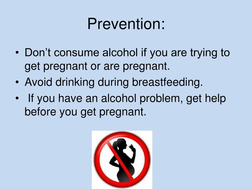 Prevention: • Don’t consume alcohol if you are trying to get pregnant or are pregnant. • Avoid drinking during breastfeeding. • If you have an alcohol problem, get help before you get pregnant.