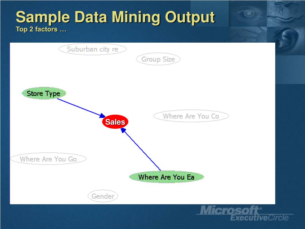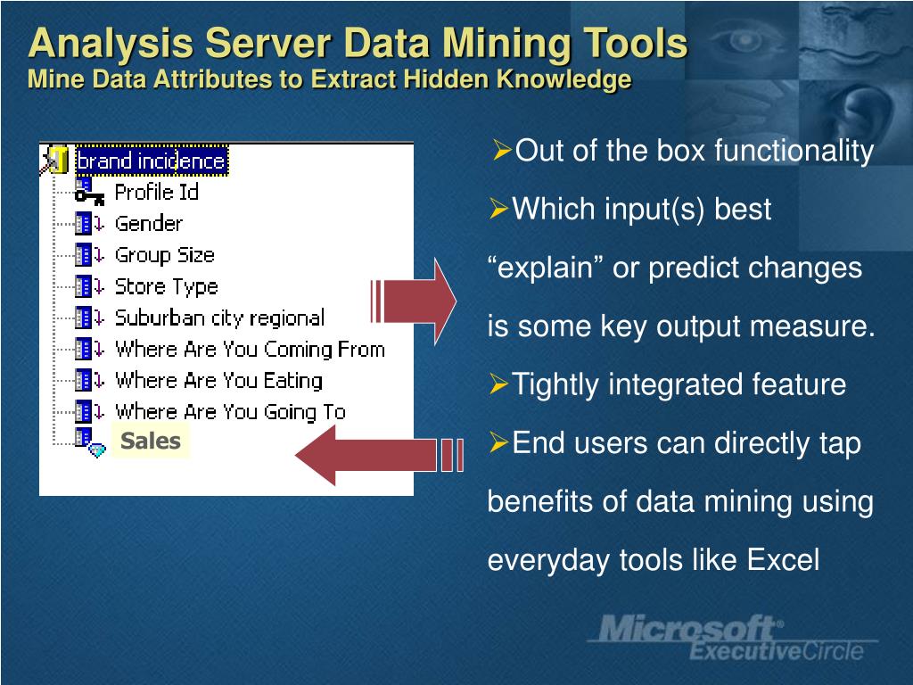 Analysis Server Data Mining Tools Mine Data Attributes to Extract Hidden Knowledge • Out of the box functionality • Which input(s) best “explain” or predict changes is some key output measure. • Tightly integrated feature • End users can directly tap benefits of data mining using everyday tools like Excel Sales