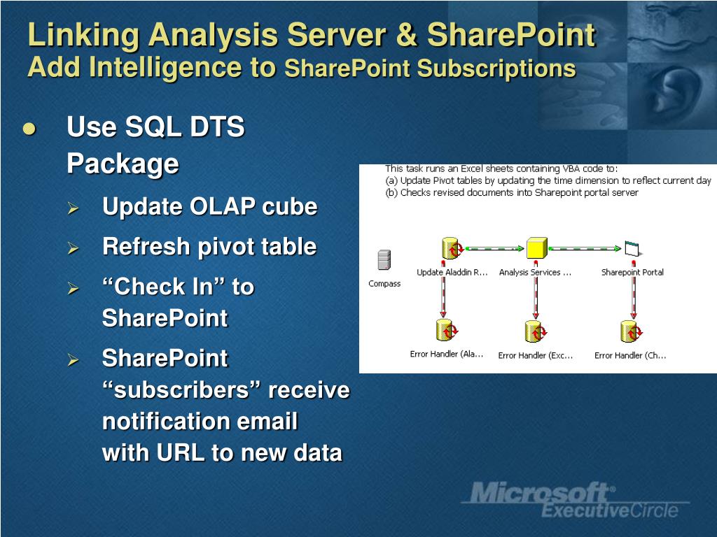 Linking Analysis Server & SharePointAdd Intelligence to SharePoint Subscriptions • Use SQL DTS Package • Update OLAP cube • Refresh pivot table • “Check In” to SharePoint • SharePoint “subscribers” receive notification email with URL to new data