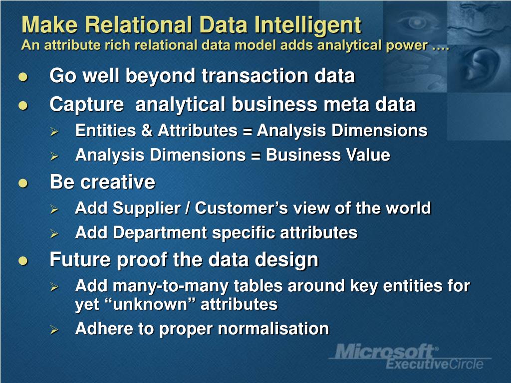 Make Relational Data IntelligentAn attribute rich relational data model adds analytical power …. • Go well beyond transaction data • Capture analytical business meta data • Entities & Attributes = Analysis Dimensions • Analysis Dimensions = Business Value • Be creative • Add Supplier / Customer’s view of the world • Add Department specific attributes • Future proof the data design • Add many-to-many tables around key entities for yet “unknown” attributes • Adhere to proper normalisation