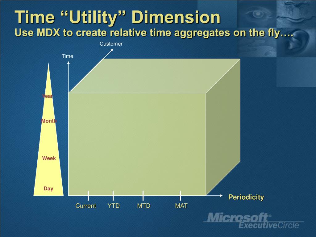 Time “Utility” DimensionUse MDX to create relative time aggregates on the fly…. Customer Time Year Month Week Day Periodicity Current YTD MTD MAT