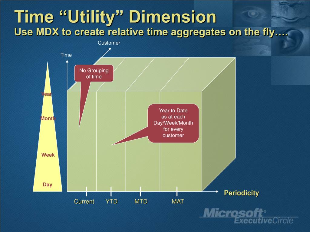 Time “Utility” DimensionUse MDX to create relative time aggregates on the fly…. Customer Time No Groupingof time Year Year to Date as at eachDay/Week/Monthfor every customer Month Week Day Periodicity Current YTD MTD MAT