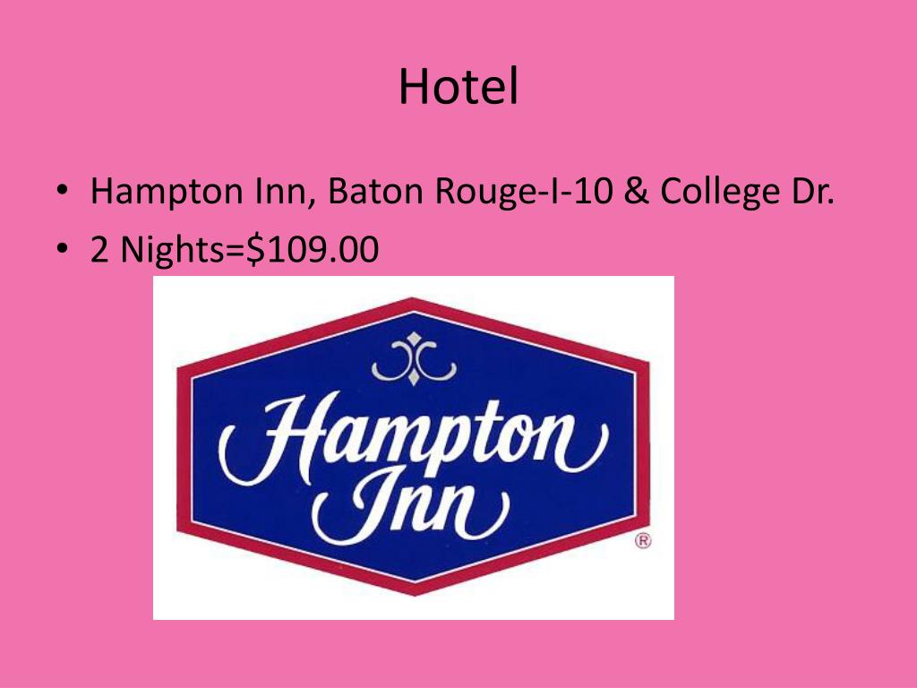 My $600 Trip to Baton Rouge=). Transportation. Gas (for car)=$75.00. Hotel. Hampton Inn, Baton Rouge-I-10 & College Dr. 2 Nights=$109.00. Restaurants. Copeland’s Cheesecake Bistro=$50.00 Chinese Food=$10.00 Red Lobster=$25.00 McDonalds=$5.00 Total……………………..$90.00.