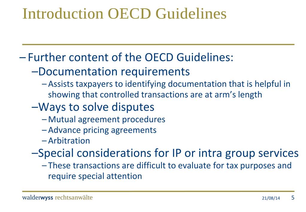 Introduction OECD Guidelines • Further content of the OECD Guidelines: • Documentation requirements • Assists taxpayers to identifying documentation that is helpful in showing that controlled transactions are at arm’s length • Ways to solve disputes • Mutual agreement procedures • Advance pricing agreements • Arbitration • Special considerations for IP or intra group services • These transactions are difficult to evaluate for tax purposes and require special attention