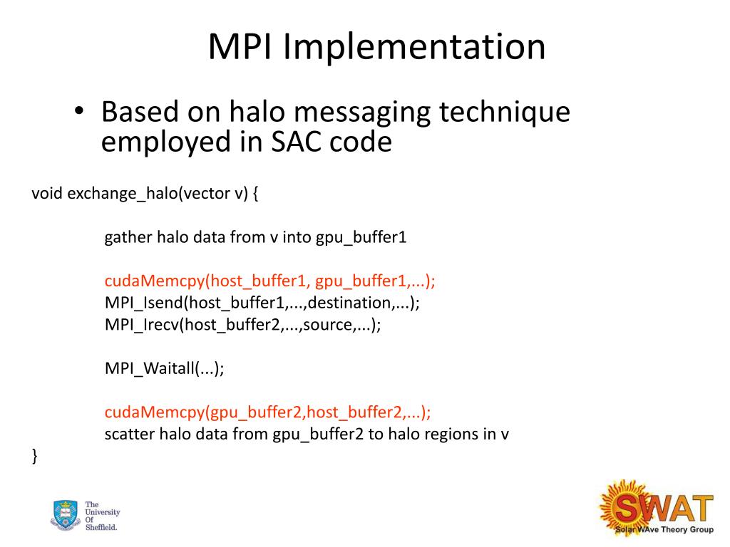 MPI Implementation • Based on halo messaging technique employed in SAC code void exchange_halo(vector v) { gather halo data from v into gpu_buffer1cudaMemcpy(host_buffer1, gpu_buffer1,...);MPI_Isend(host_buffer1,...,destination,...);MPI_Irecv(host_buffer2,...,source,...); MPI_Waitall(...); cudaMemcpy(gpu_buffer2,host_buffer2,...); scatter halo data from gpu_buffer2 to halo regions in v}