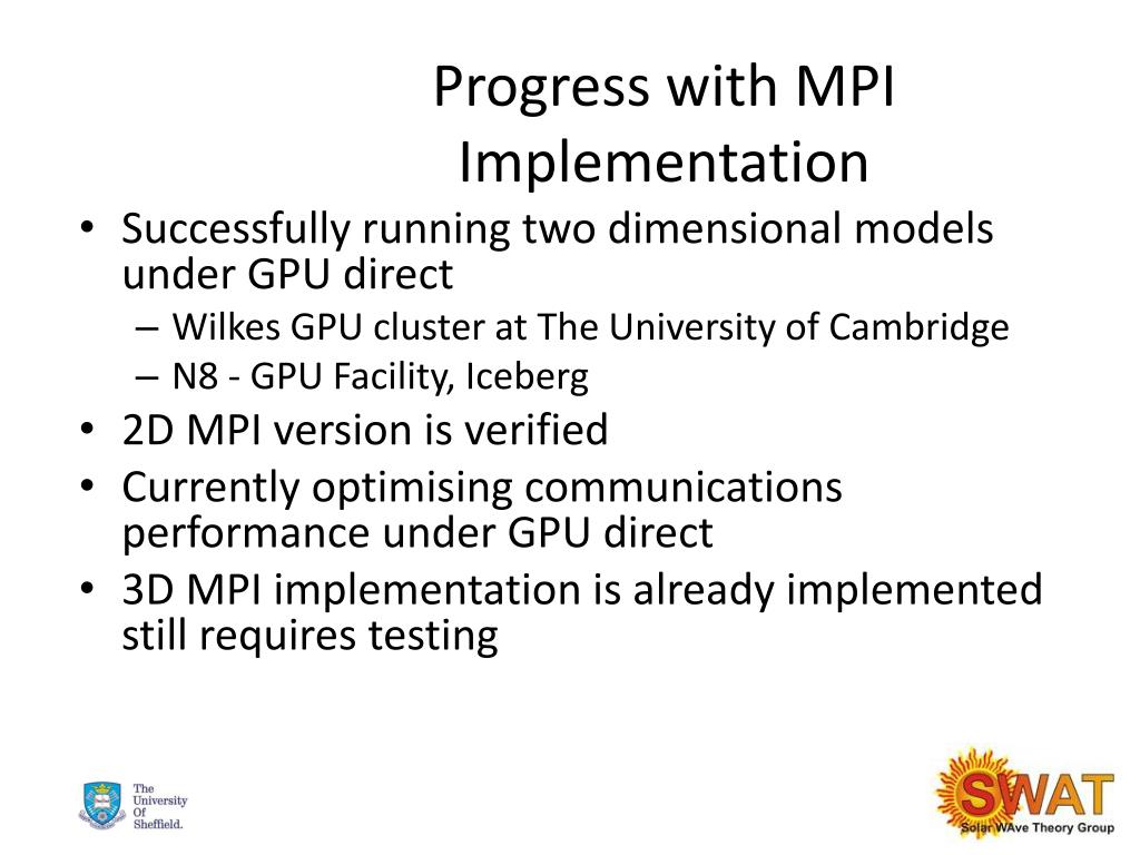 Progress with MPI Implementation • Successfully running two dimensional models under GPU direct • Wilkes GPU cluster at The University of Cambridge • N8 - GPU Facility, Iceberg • 2D MPI version is verified • Currently optimising communications performance under GPU direct • 3D MPI implementation is already implemented still requires testing