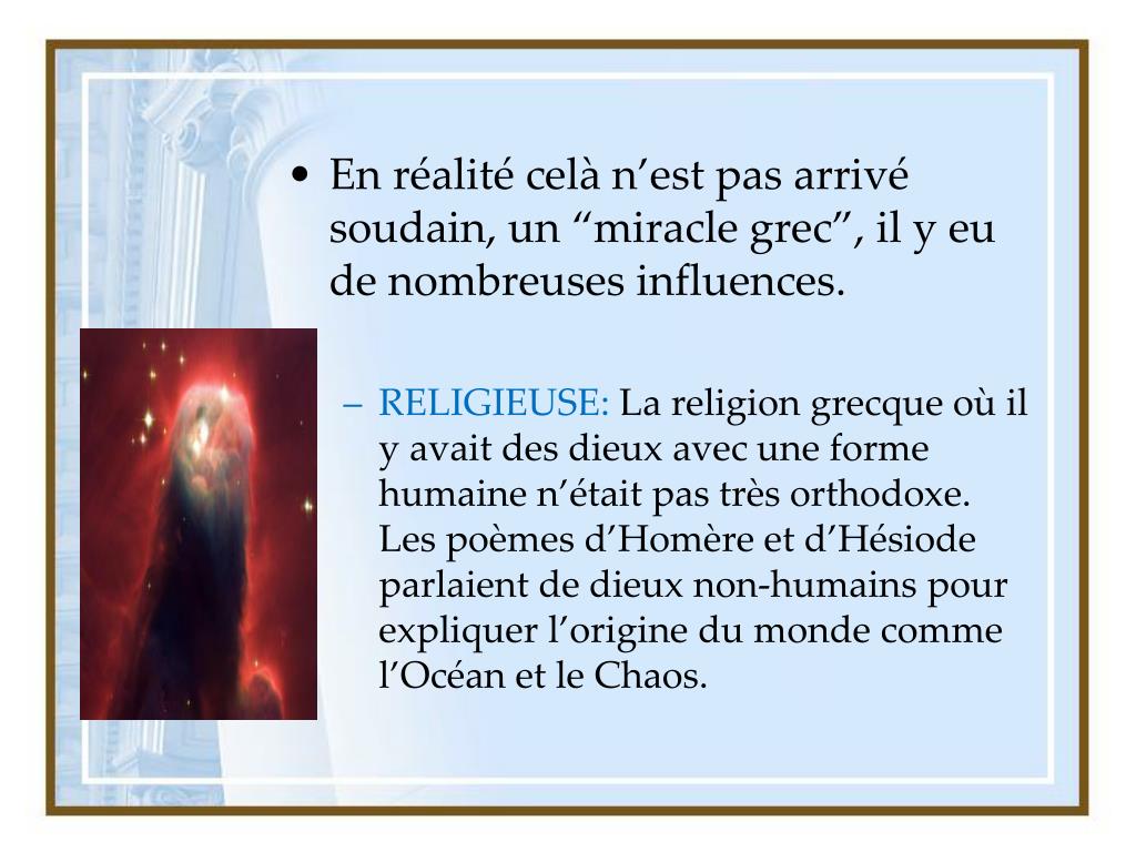 En réalité celà n’est pas arrivé soudain, un “miracle grec”, il y eu de nombreuses influences. • RELIGIEUSE: La religion grecque où il y avait des dieux avec une forme humaine n’était pas très orthodoxe. Les poèmes d’Homère et d’Hésiode parlaient de dieux non-humains pour expliquer l’origine du monde comme l’Océan et le Chaos.