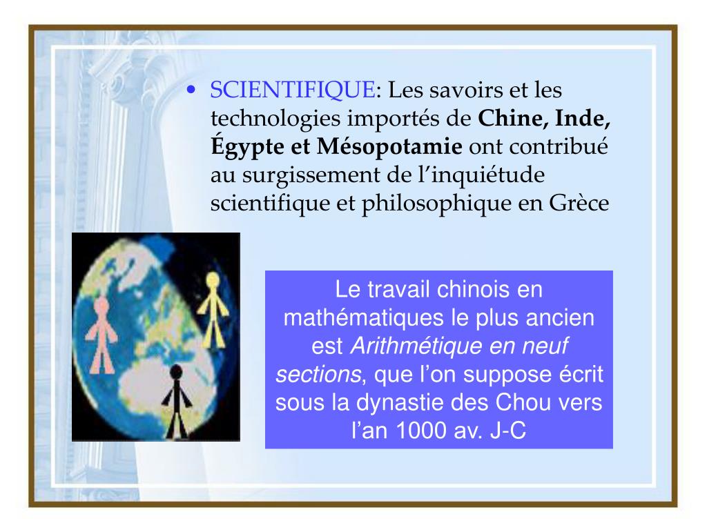 SCIENTIFIQUE: Les savoirs et les technologies importés de Chine, Inde, Égypte et Mésopotamie ont contribué au surgissement de l’inquiétude scientifique et philosophique en Grèce Le travail chinois en mathématiques le plus ancien est Arithmétique en neuf sections, que l’on suppose écrit sous la dynastie des Chou vers l’an 1000 av. J-C