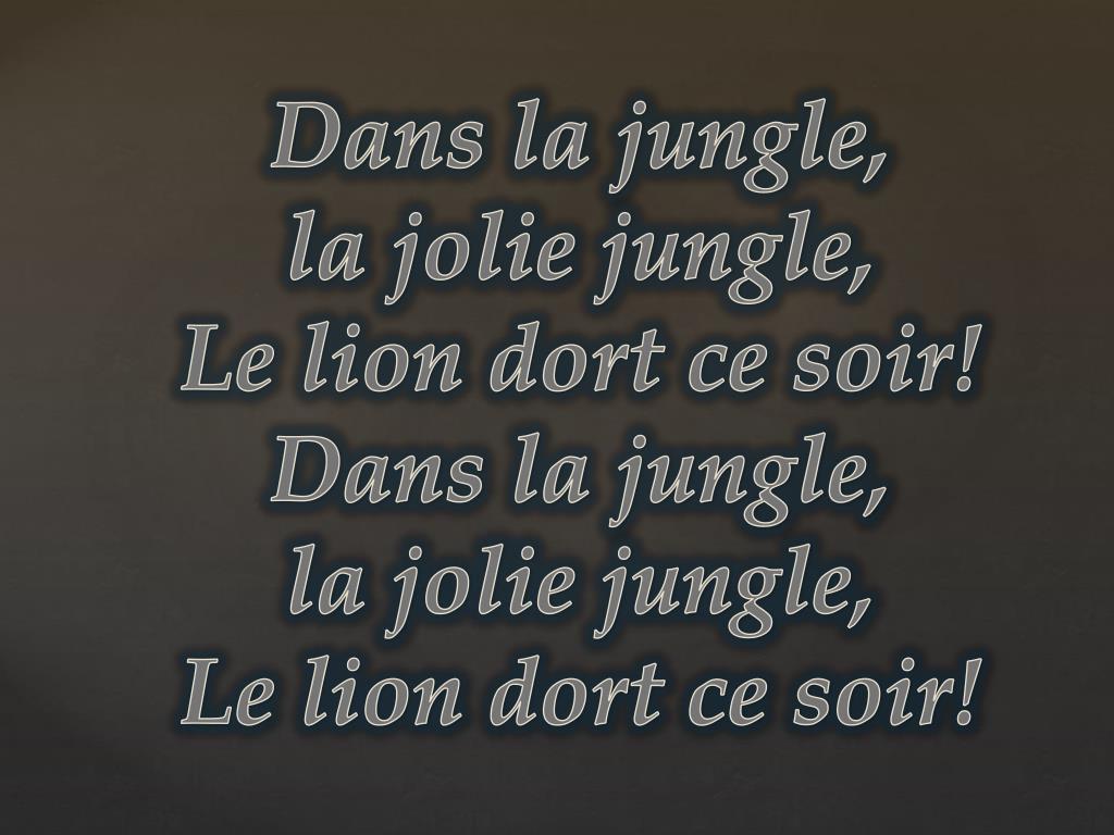 Dans la jungle, la jolie jungle, Le lion dort ce soir! Dans la jungle, la jolie jungle, Le lion dort ce soir!