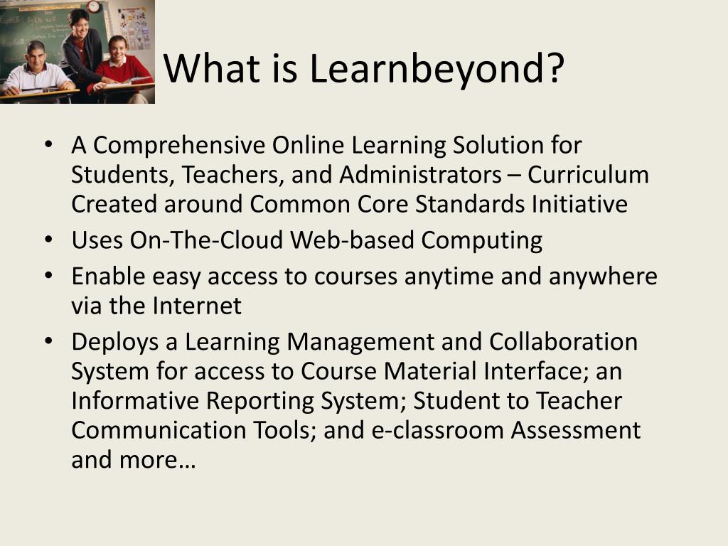 What is Learnbeyond? • A Comprehensive Online Learning Solution for Students, Teachers, and Administrators – Curriculum Created around Common Core Standards Initiative • Uses On-The-Cloud Web-based Computing • Enable easy access to courses anytime and anywhere via the Internet • Deploys a Learning Management and Collaboration System for access to Course Material Interface; an Informative Reporting System; Student to Teacher Communication Tools; and e-classroom Assessment and more…