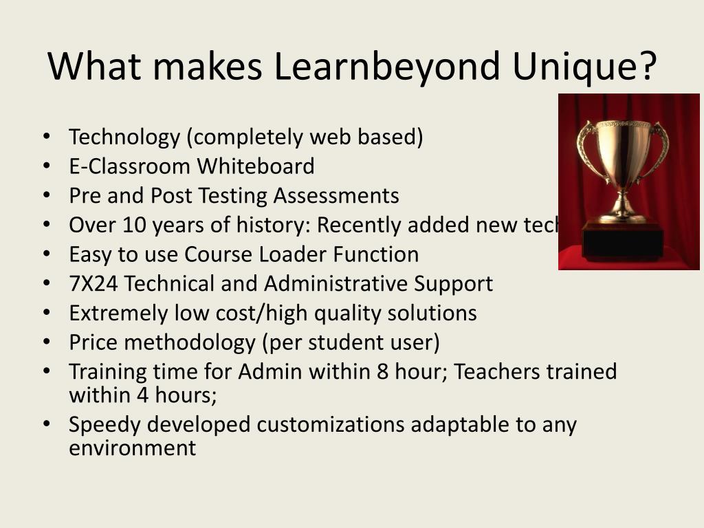 What makes Learnbeyond Unique? • Technology (completely web based) • E-Classroom Whiteboard • Pre and Post Testing Assessments • Over 10 years of history: Recently added new technology • Easy to use Course Loader Function • 7X24 Technical and Administrative Support • Extremely low cost/high quality solutions • Price methodology (per student user) • Training time for Admin within 8 hour; Teachers trained within 4 hours; • Speedy developed customizations adaptable to any environment