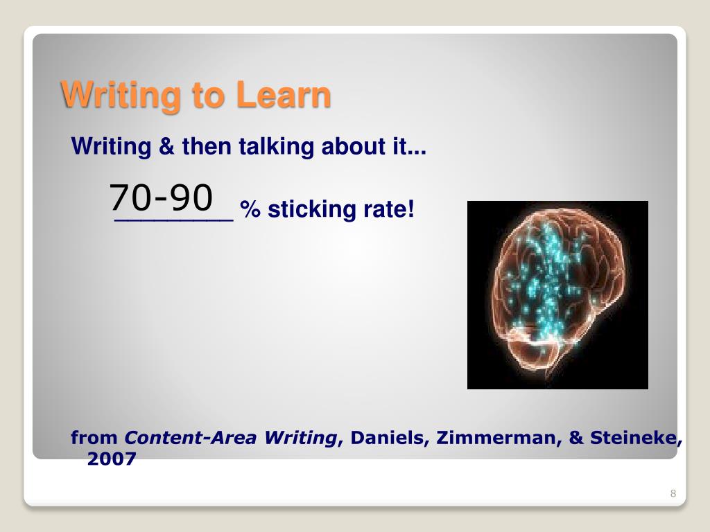 Writing & then talking about it... _________ % sticking rate! from Content-Area Writing, Daniels, Zimmerman, & Steineke, 2007 70-90 Writing to Learn