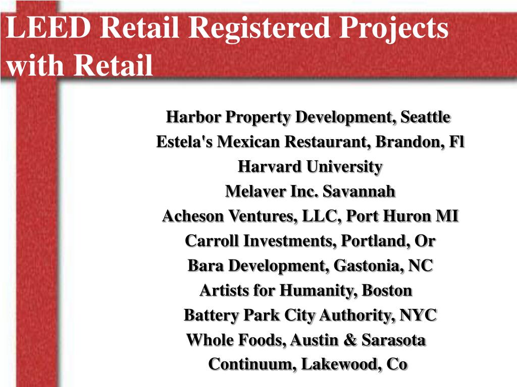LEED Retail Registered Projects with Retail 1 Harbor Property Development, Seattle Estela's Mexican Restaurant, Brandon, Fl Harvard University Melaver Inc. Savannah Acheson Ventures, LLC, Port Huron MI Carroll Investments, Portland, Or Bara Development, Gastonia, NC Artists for Humanity, Boston Battery Park City Authority, NYC Whole Foods, Austin & Sarasota Continuum, Lakewood, Co