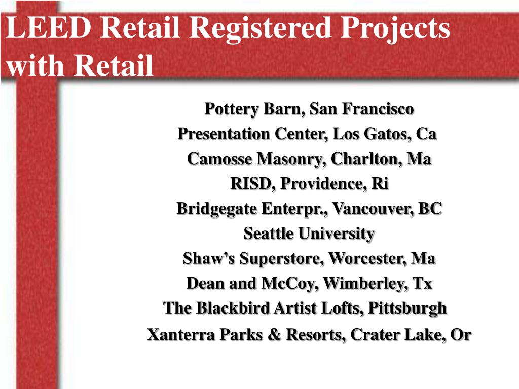 LEED Retail Registered Projects with Retail 1 Pottery Barn, San Francisco Presentation Center, Los Gatos, Ca Camosse Masonry, Charlton, Ma RISD, Providence, Ri Bridgegate Enterpr., Vancouver, BC Seattle University Shaw’s Superstore, Worcester, Ma Dean and McCoy, Wimberley, Tx The Blackbird Artist Lofts, Pittsburgh Xanterra Parks & Resorts, Crater Lake, Or