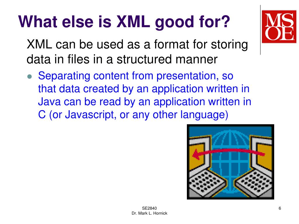 What is XML good for? XML can be used to define the format to exchange information in a “neutral” format that is language and platform independent • Javascript/AJAX can request a complex response in XML format, rather than as text SE2840 Dr. Mark L. Hornick