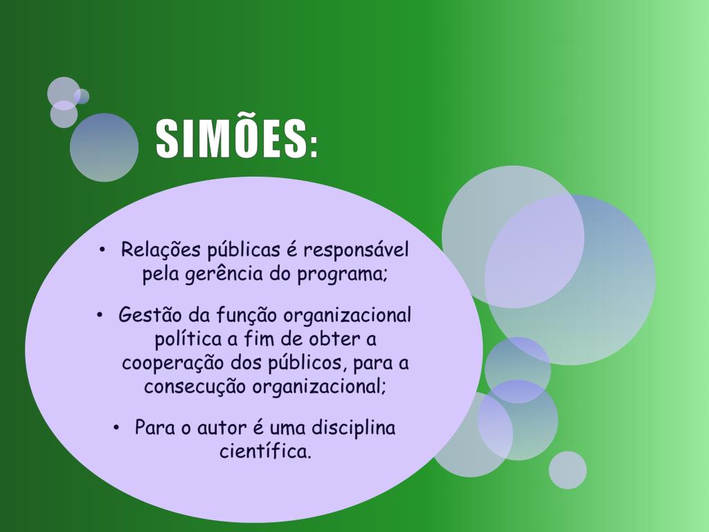 SIMÕES: Relações públicas é responsável pela gerência do programa; Gestão da função organizacional política a fim de obter a cooperação dos públicos, para a consecução organizacional; Para o autor é uma disciplina científica.