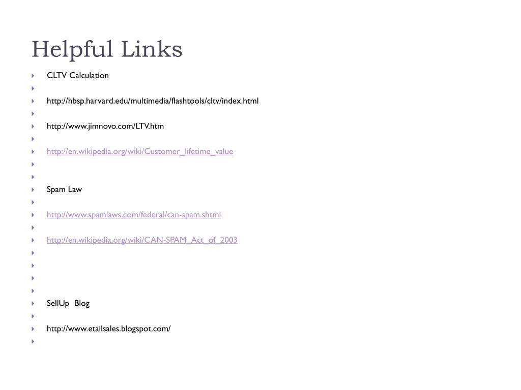 Helpful Links • CLTV Calculation • http://hbsp.harvard.edu/multimedia/flashtools/cltv/index.html • http://www.jimnovo.com/LTV.htm • http://en.wikipedia.org/wiki/Customer_lifetime_value • Spam Law • http://www.spamlaws.com/federal/can-spam.shtml • http://en.wikipedia.org/wiki/CAN-SPAM_Act_of_2003 • SellUp Blog • http://www.etailsales.blogspot.com/