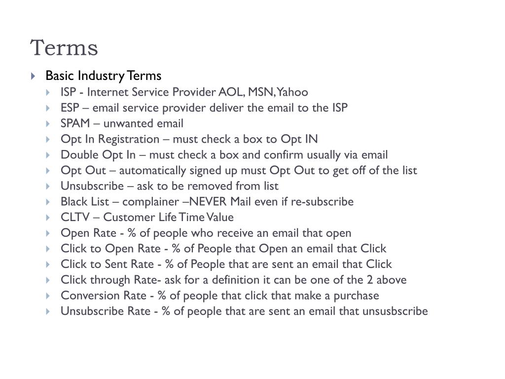 Terms • Basic Industry Terms • ISP - Internet Service Provider AOL, MSN, Yahoo • ESP – email service provider deliver the email to the ISP • SPAM – unwanted email • Opt In Registration – must check a box to Opt IN • Double Opt In – must check a box and confirm usually via email • Opt Out – automatically signed up must Opt Out to get off of the list • Unsubscribe – ask to be removed from list • Black List – complainer –NEVER Mail even if re-subscribe • CLTV – Customer Life Time Value • Open Rate - % of people who receive an email that open • Click to Open Rate - % of People that Open an email that Click • Click to Sent Rate - % of People that are sent an email that Click • Click through Rate- ask for a definition it can be one of the 2 above • Conversion Rate - % of people that click that make a purchase • Unsubscribe Rate - % of people that are sent an email that unsusbscribe