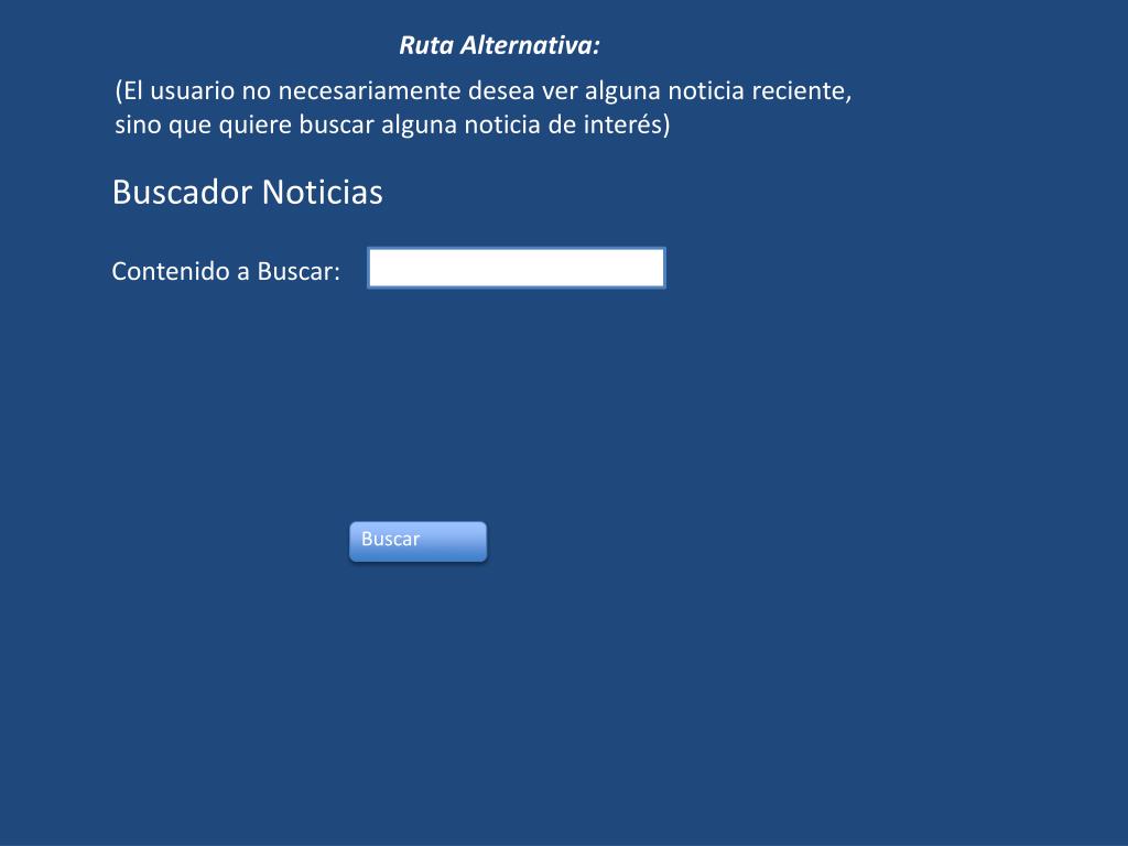 Ruta Alternativa: (El usuario no necesariamente desea ver alguna noticia reciente, sino que quiere buscar alguna noticia de interés) Buscador Noticias Contenido a Buscar: Buscar
