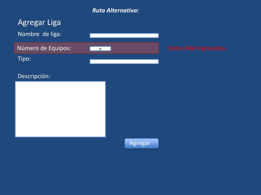Ruta Alternativa: Agregar Liga Nombre de liga: Número de Equipos: Datos Mal Ingresados e Tipo: 33jije34 Descripción: Agregar