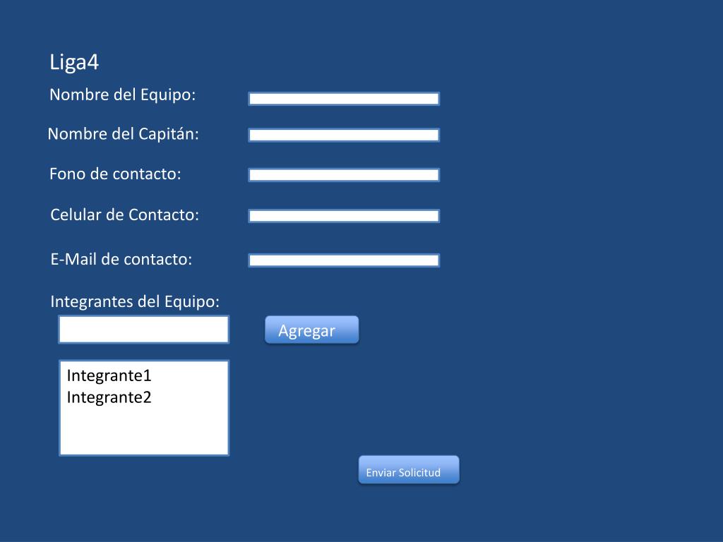 Liga4 Nombre del Equipo: Nombre del Capitán: Fono de contacto: Celular de Contacto: E-Mail de contacto: Integrantes del Equipo: Agregar Integrante1 Integrante2 Enviar Solicitud