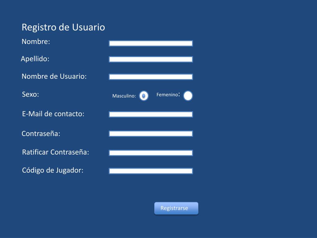 Registro de Usuario Nombre: Apellido: Nombre de Usuario: Femenino: Sexo: Masculino: E-Mail de contacto: Contraseña: Ratificar Contraseña: Código de Jugador: Registrarse