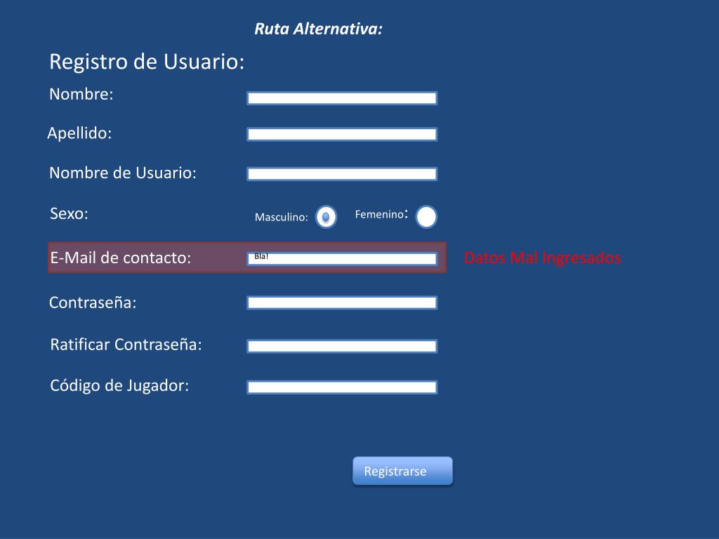 Ruta Alternativa: Registro de Usuario: Nombre: Apellido: Nombre de Usuario: Femenino: Sexo: Masculino: E-Mail de contacto: Datos Mal Ingresados Bla! Contraseña: Ratificar Contraseña: Código de Jugador: Registrarse