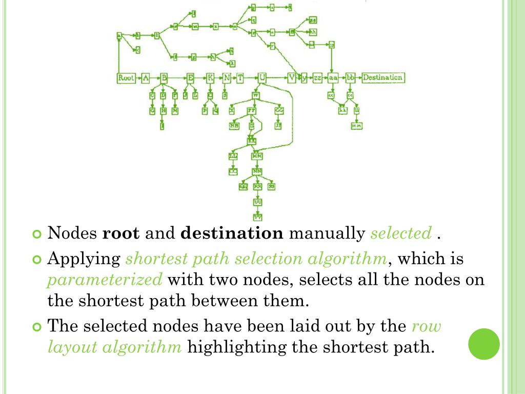 Nodes root and destination manually selected . • Applying shortest path selection algorithm, which is parameterized with two nodes, selects all the nodes on the shortest path between them. • The selected nodes have been laid out by the row layout algorithm highlighting the shortest path.