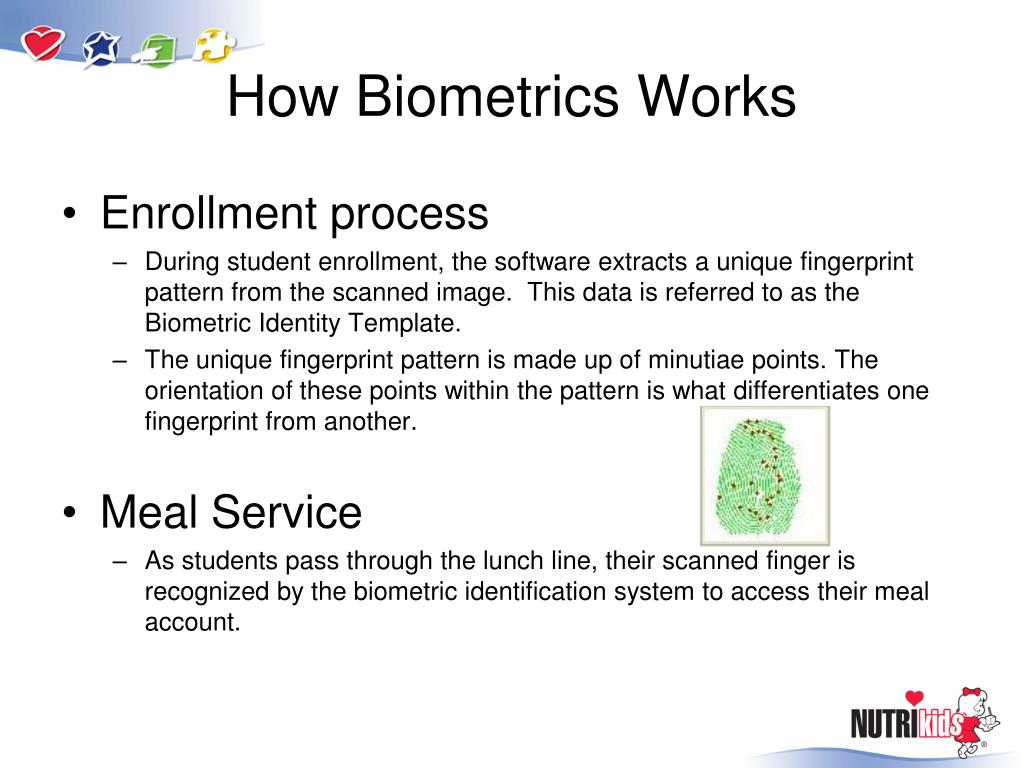 How Biometrics Works • Enrollment process • During student enrollment, the software extracts a unique fingerprint pattern from the scanned image. This data is referred to as the Biometric Identity Template. • The unique fingerprint pattern is made up of minutiae points. The orientation of these points within the pattern is what differentiates one fingerprint from another. • Meal Service • As students pass through the lunch line, their scanned finger is recognized by the biometric identification system to access their meal account.