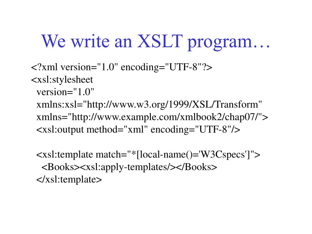 We write an XSLT program… <?xml version="1.0" encoding="UTF-8"?> <xsl:stylesheet version="1.0" xmlns:xsl="http://www.w3.org/1999/XSL/Transform" xmlns="http://www.example.com/xmlbook2/chap07/"> <xsl:output method="xml" encoding="UTF-8"/> <xsl:template match="*[local-name()='W3Cspecs']"> <Books><xsl:apply-templates/></Books> </xsl:template>