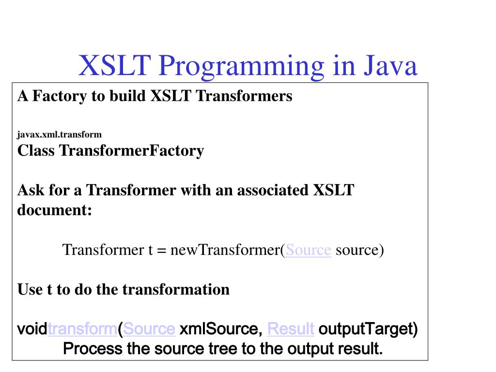 XSLT Programming in Java A Factory to build XSLT Transformers javax.xml.transform Class TransformerFactory Ask for a Transformer with an associated XSLT document: Transformer t = newTransformer(Source source) Use t to do the transformation voidtransform(Source xmlSource, Result outputTarget) Process the source tree to the output result.