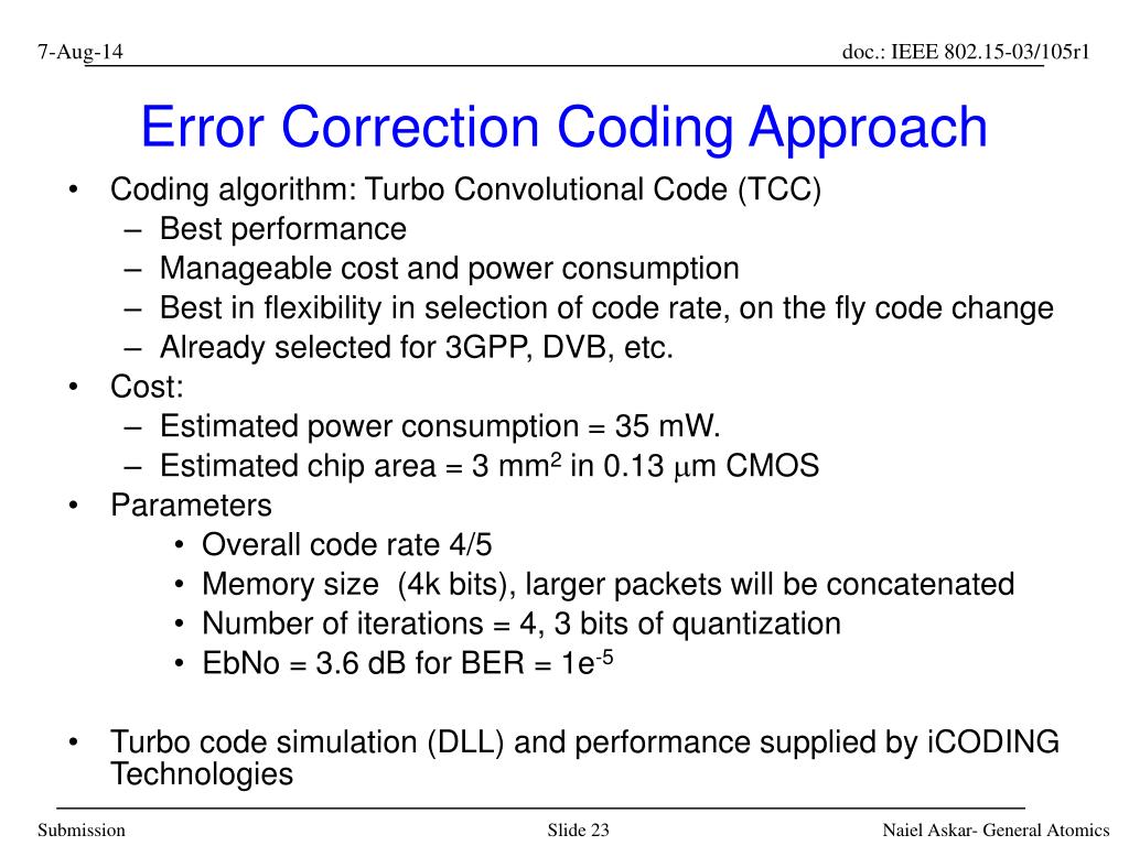 Error Correction Coding Approach • Coding algorithm: Turbo Convolutional Code (TCC) • Best performance • Manageable cost and power consumption • Best in flexibility in selection of code rate, on the fly code change • Already selected for 3GPP, DVB, etc. • Cost: • Estimated power consumption = 35 mW. • Estimated chip area = 3 mm2 in 0.13 mm CMOS • Parameters • Overall code rate 4/5 • Memory size (4k bits), larger packets will be concatenated • Number of iterations = 4, 3 bits of quantization • EbNo = 3.6 dB for BER = 1e-5 • Turbo code simulation (DLL) and performance supplied by iCODING Technologies