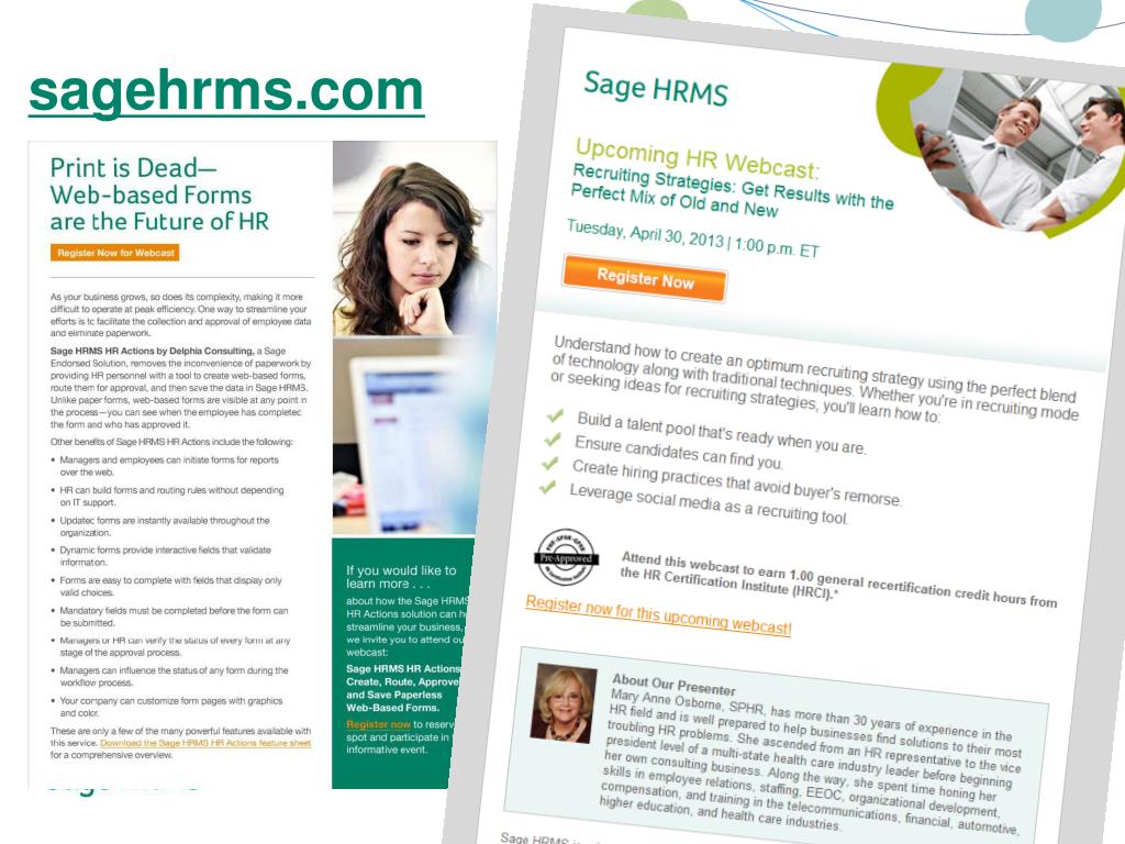 Sage Employer SolutionsSage HRMS HRMS leader since 1985 Developed by HR professionals for HR professionals Customizable solution that meets your Organization’s needs and budget Core HRMS is “single point of truth!” Extended solutions offer “best of breed” Tools to engage employees & empower Management, Finance, Human Resources!