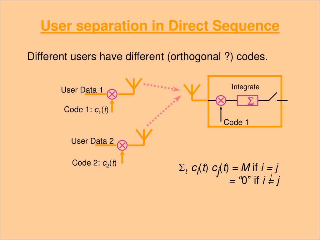 St ci(t) cj(t) =M if i = j = “0” if i = j User separation in Direct Sequence • Different users have different (orthogonal ?) codes. Integrate User Data 1 S Code 1: c1(t) Code 1 User Data 2 Code 2: c2(t)