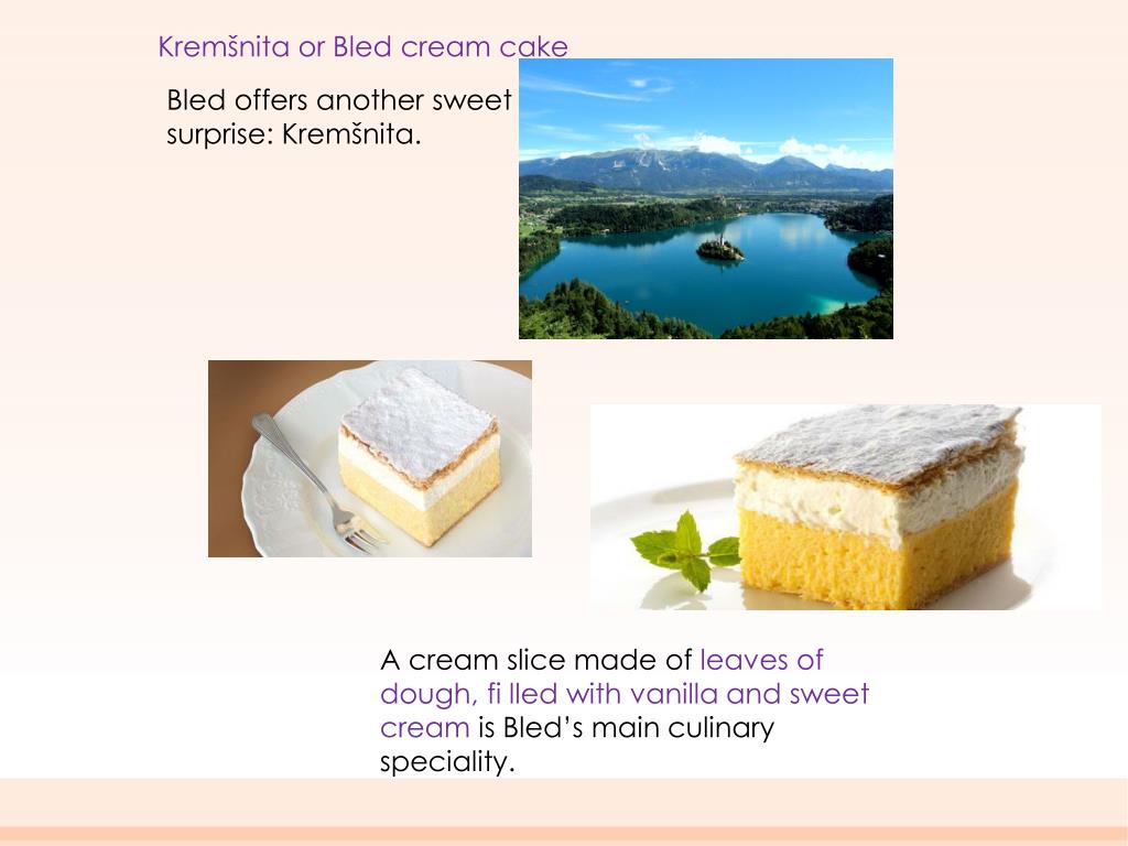 Kremšnita or Bled creamcake Bled offersanothersweetsurprise: Kremšnita. A cream slice made of leaves of dough, filled with vanilla and sweet cream is Bled’s main culinary speciality.