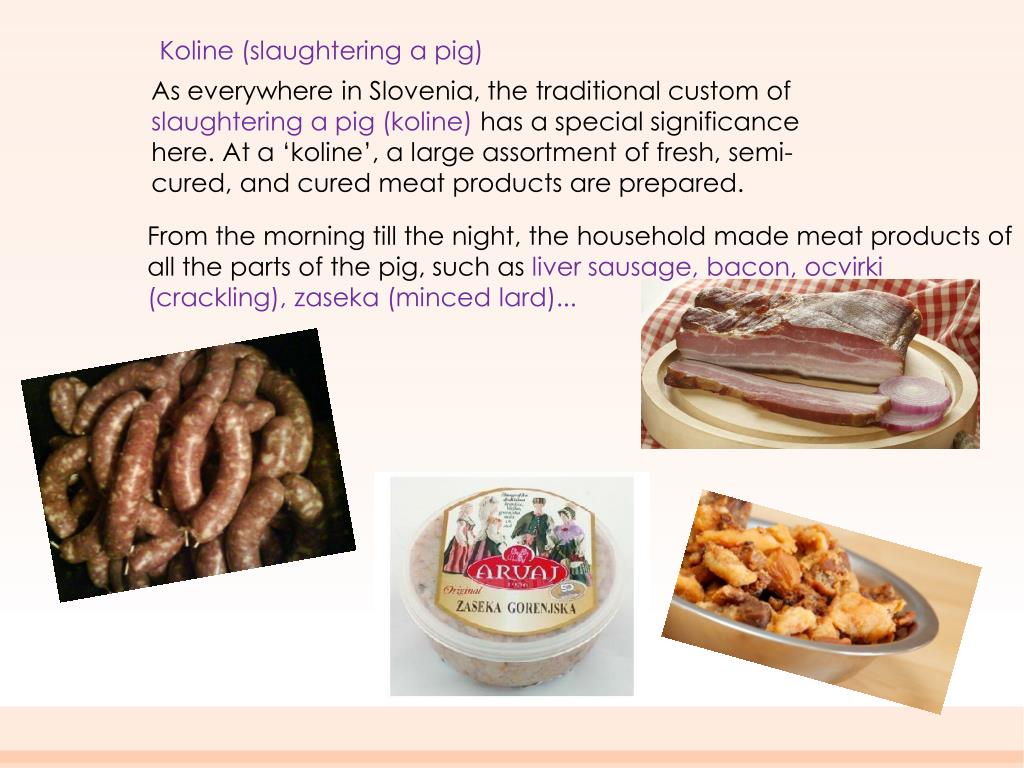 On thisday, ther are on themenu: homemade sausages and prepared meat for preserving, drying and smoking. The pig is slaughtered and meat prepared and made into : • krvavice (blood sausages), • pečenice (frying sausages), Krvavice are made from the head, offal, meat cutoffs, lard and bacon, millet, buckwheat and barley meal, spices and blood. In more recent times, rice has been added. In Primorskaregion they sometimes add sugar and raisins.